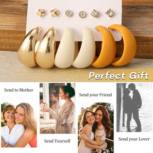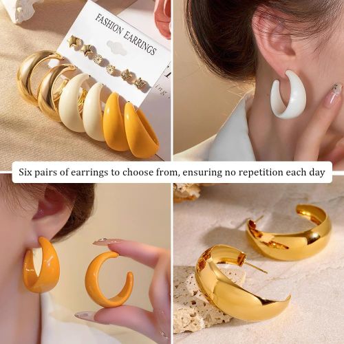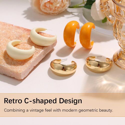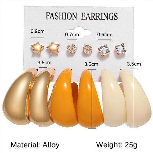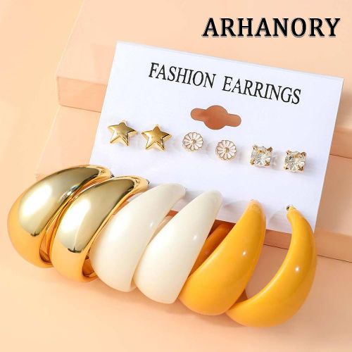 ARHANORY's 6-piece earring set: 3 acrylic C-shaped hoops and 3 mini alloy studs. The studs feature a rhinestone-encrusted design, a daisy flower, and a star shape. This versatile collection is perfect for offices, weddings, and parties, offering a stylish and elegant look for any outfit.