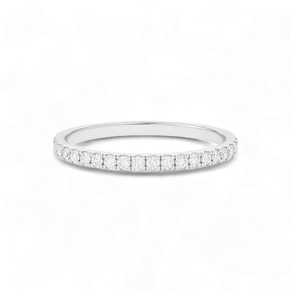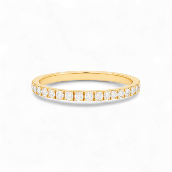 The 2MM Moissanite Pavé Wedding Band is a delicate yet dazzling piece, featuring a continuous row of brilliant moissanite stones that sparkle with fire and clarity. Crafted in rich 18KT gold, its slim profile makes it perfect for stacking, pairing with an engagement ring, or wearing solo as a graceful symbol of everlasting love.