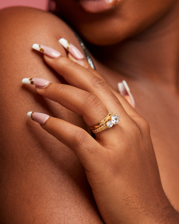 Crafted in luxurious 18K gold, the matching wedding band is adorned with a row of perfectly set CZ stones, designed to complement and nestle seamlessly with the engagement ring. The Abby set is a refined choice for the bride who desires timeless elegance with a modern touch.