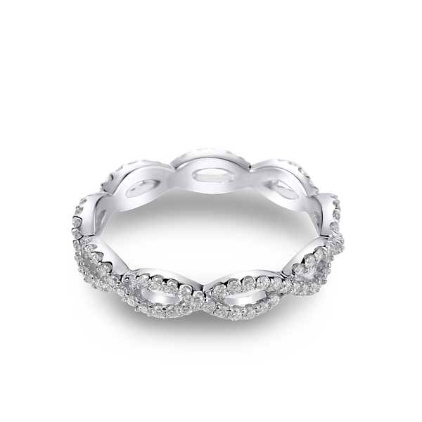 Each twist of the infinity design represents unbreakable connection, while the high-polish 925 sterling silver setting offers a sleek, modern finish with lasting durability. Whether worn as a wedding band, anniversary ring, or meaningful gift, this piece adds a graceful touch of brilliance to any look.