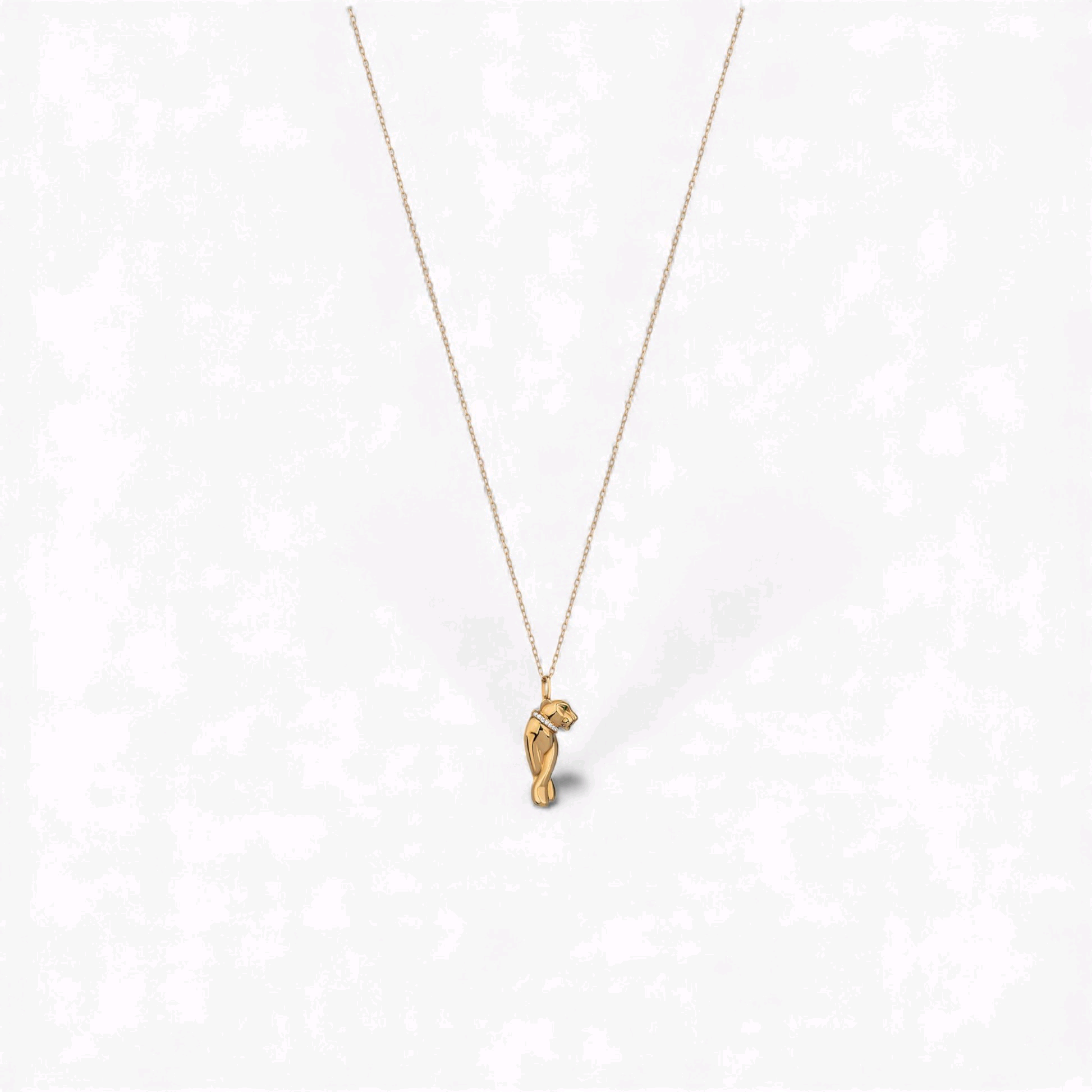 Unleash the spirit of strength and desire with our Panther Diamond Necklace, masterfully sculpted in polished 18KT yellow gold. This commanding pendant captures the wild grace of the panther, fierce, fearless, and eternally protective, an emblem of love that dares to defy. The pendant is suspended from a fine 18K gold chain that drapes like liquid light across the skin, resting gently at the collarbone.