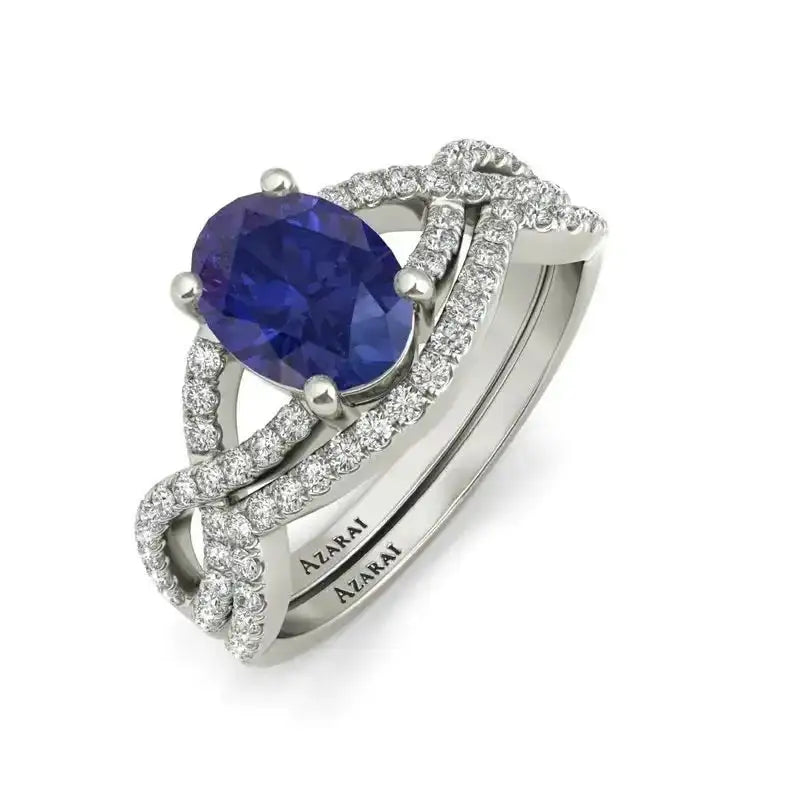 Adelaide sterling silver bridal features a stunning deep blue sapphire oval-cut solitaire center stone. The center stone is complemented by a twisted shank and a dainty wedding band to match.