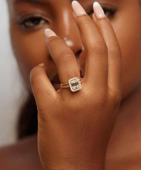 Exquisite and regal, the Royal Baguette Cut Natural Diamond Bride Set is a true statement of elegance, crafted in rich 18 Karat gold. At its center, a striking baguette-cut diamond shines with sophistication, encased in a radiant halo of natural diamonds that amplify its brilliance. The diamond-studded band adds depth and sparkle, creating a harmonious balance of modern luxury and timeless grace.