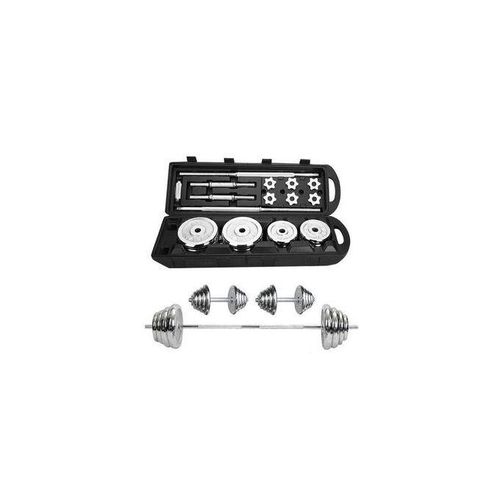 The 50kg black cast iron barbell and dumbbell weight set is a quality choice designed to enhance your strength training, especially focussing on your upper body. However, the equipment can be combined with exercises such as squats, lunges and more to work your whole body, making it a handy addition to your fitness routine. The chrome plated bar and dumbbell bars have knurled handles that improve your grip, letting you work out with confidence, and the weight plates have a durable black finish. The set is made to endure intense training sessions and the 14 cast iron plates allow you to vary the weight you lift, with spinlock collars to secure the plates in position. The 50kg corresponds to the complete weight of the set, which includes the weight plates, bars and the spinlock collars.