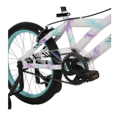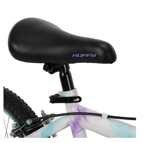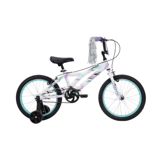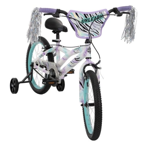 18-inch Bike for Girls Get ready for exciting childhood memories with this 18" Unleash Bike by Huffy. This bicycle features a great style with a durable steel frame decorated in white marble paint effect. A coordinating handlebar plaque completes the overall style. This 18-inch bike has an adorable look with great features! This single-speed bike comes with front handbrakes for solid stopping control. Plus, the wide training wheels can be removed; which makes it a great combination for learning to ride! An alloy quick-release lever makes it easy to adjust the seat to the right height. This seat is padded to make sure every ride is comfortable. Plus, this bike features sparkly streamers that glisten in the wind as she rides! This totally decorated 18" bicycle by Huffy is just what your child wants. From Huffy, We Make Fun.