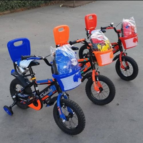 This stylish kids' bicycle comes with training wheels and a safety helmet, perfect for young riders learning to balance and ride confidently. It features a strong steel frame, comfortable seat, front basket, and rear backrest for added safety. The colorful design and sturdy tires make it suitable for both indoor and outdoor fun. Ideal for children aged 3 to 6 years.