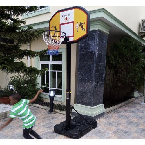 This movable basketball with strong steel post with roller tires. It comes with components like board, ring and net. Suitable for both indoors and outdoor use, home use, schools, sport centres, recreational centers Size:109*70*3cm Rim board materials:PE Petented Crank Base size:110*76*21cm It can be filled with 100kg water or 150kg sand It is moveable Strong Rim adjustment