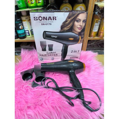 Sonar Professional Hair Dryer SN-6170, a 2-in-1 device with 4000W power. It is designed for efficient and quick hair drying, with multiple heat and speed settings, a cool shot button, and attachments for various styling needs.