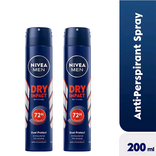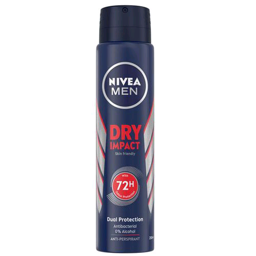NIVEA MEN Dry Impact Anti-Perspirant offers you 72h reliable protection with unique skin comfort. The effective dual protect formula with 2 antibacterial actives keeps your armpits dry and prevents malodor. At the same time, this skin-friendly formula with 0% alcohol supports a comfortable skin feeling. Its skin tolerance has been dermatologically proven. The unique dry and comfortable skin feeling is accompanied by a virile fragrance with clean, inviting, and aromatic fresh blend of tangy citrus and herbal notes. Designed for men who want maximum protection with reassuring masculine fragrance.