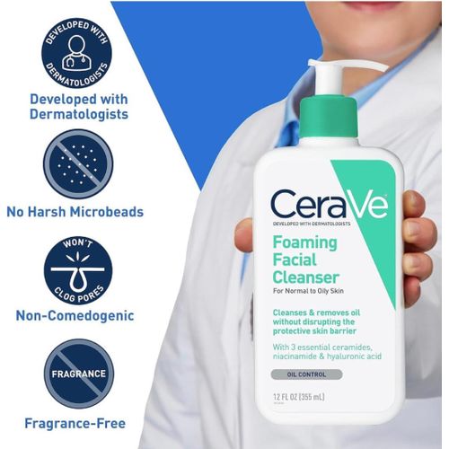CeraVe Foaming Face Wash, Daily Face Cleanser for Normal to Oily Skin has a unique formula with three essential ceramides (1, 3, 6-II) that cleanses and removes oil without disrupting the protective skin barrier. Gentle foaming action refreshes and cleanses skin, including removing excess oils. Suitable for use on the face, body, even hands. Unique formula with three essential ceramides (1, 3, 6-II) that cleanses and removes oil without disrupting the skincare barrier or leaving the skin feeling stripped of moisture.