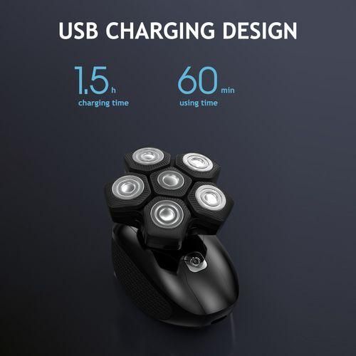 The head razors for bald men's 6D floating cutter heads with double-track ultra-thin cutter net and self-sharpening steel blade design, automatically adapts to the contours of your head and face, can gently cut hair above skin and help the shavers glide smoothly over your skin. The design of 6 cutter heads increases the shaving area and saves shaving time. Our skull shavers is designed with a non-slip handle for easy gripping, a great choice for your shaved heads.