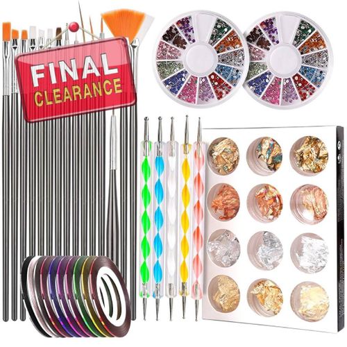 Nail art addict kit: Come with 15pcs nail art design brush set, 5pcs nail art 2-ways drawing dotting painting pens, 2 boxes nail-art rhinestones,10pcs assorted colors nail striping tapes and 12 pots paillette foil sticker in 4 colors. These items were fine for decorating with variety. The brushes were the biggest hit