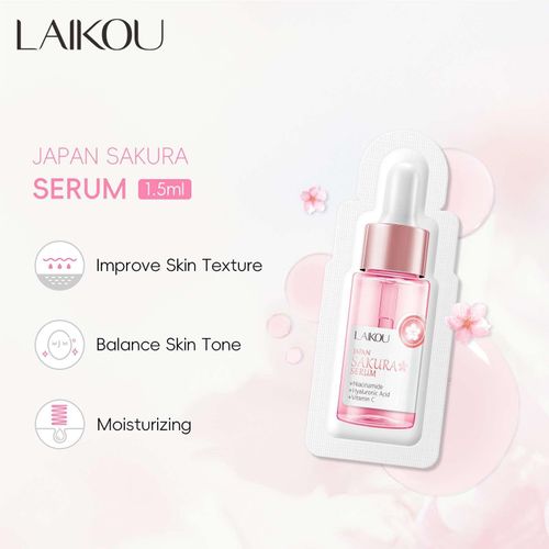 Achieve a smooth, radiant glow with this Japan Sakura Brightening Serum Sachet by LAIKOU — a gentle daily serum infused with Niacinamide, Hyaluronic Acid, and Vitamin C.
