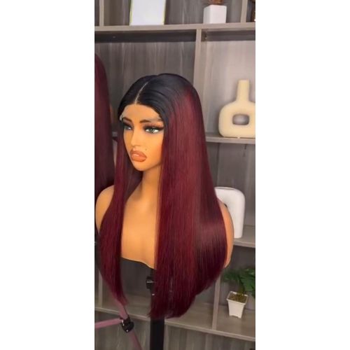 This wig is a very beautiful and classic 2 tone closure wig just as displayed. The length is 18" and colour is burgundy. It strands are so healthy that it does not tangle nor shed. It has a soft and silky texture and the quality is amazing. It fits the scalp perfectly which makes it very easy to wear without glue. It also has an elastic band for those that has very small skull. It take heat uoto 200°C. It's a good quality hair you will enjoy for a long time. We have other amazing styles of wigs in the store. Kindly click on store name(Mike Kings global business Ltd) and follow to view other wigs of good quality and affordable prices.