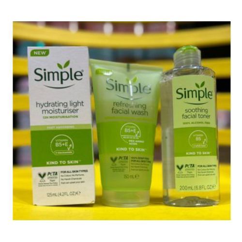 Simple hydrating light moisturiser provides care with a light feel on the skin. Leaves skin feeling soft, smooth and perfectly hydrated for upto 12 hours. Our moisturizer is made with skin loving ingredients such as pro vitamins B5 and vitamin E.Simple refreshing face wash, thouroughly washes away make up, dirts and other impurities, leaving your skin feeling clean fresh and revived. It is made with skin loving ingredients contains Tripple purified water and vitamins to help replenish and nourish your skin without irritation. For all skin types, even perfect for sensitive skin.Simple soothing facial Toner enhance your skin Care routine with a gentle yet effective toner formula. The toner works to balance your skin's natural PH level, plus it can smooth skins texture by minimizing pores.