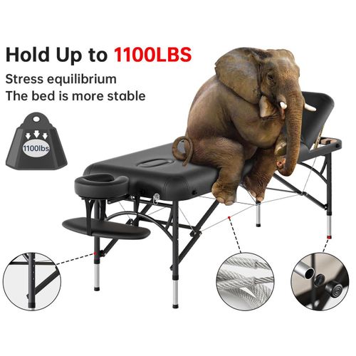 3 section Aluminum foldable massage table with one section that can be elevated, 4 legs for maximum support and stability.