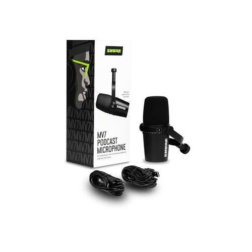 Get a professional podcast sound with audio interfaces, hard disk recorders, or direct to computers and mobile devices with the Shure MV7 Podcast Mic, styled here in black. This is a high-quality, broadcast-style dynamic microphone, one that has both a conventional XLR connection and a USB port.The Shure MV7 fulfills the needs of anyone who demands a broadcast-quality sound from their podcast microphone, no matter the setup: whether you work with an audio interface, or prefer to record directly into your computer over USB, this microphone will do the job. The mic offers a clear and present sound, extensive controls, rugged accessories, and seamless integration with the free ShurePlus MOTIV Desktop App for convenient effects right out of the gate.This microphone is part of the B&H Virtual Mic Locker, an online tool to help our valued customers determine the sonic differences between popular microphones for podcasting and voice over work. Each microphone was recorded using a Grace Design M103 preamp into a Presonus Quantum 2626 interface.The mic takes its design and sonic cues from the Shure SM7B, a classic used on countless podcasts and radio broadcasts. Use the mic in close proximity to your voice and you'll find it exhibits a clear, intelligible, and high-quality sound. Optimized frequency response for rich and natural vocal reproduction