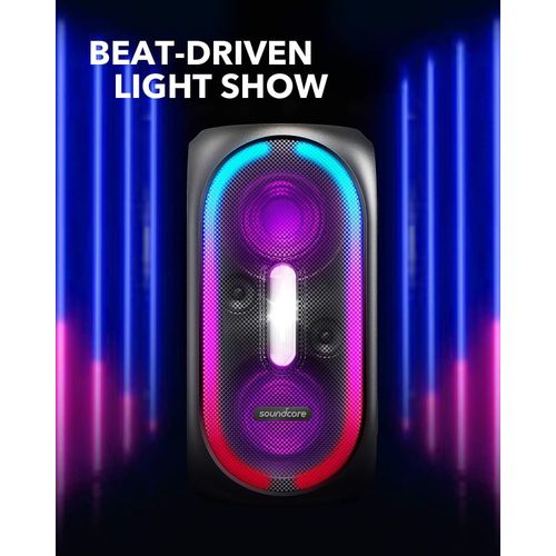 Bright Lights, Big Beats Using our custom algorithm and an independant DSP, Rave’s lights move along with the beat to dazzle the whole party. 24-Hour Playtime Anker battery technology keeps the music playing all day and all night. Portable Build Easy to pick up and take outdoors. Rave is ready to turn up the party atmosphere virtually anywhere. Rave-Chain Wireless Stereo Pairing Dual Bluetooth Co Hook up an unlimited number of Raves via RCA Audio Cables for a monster wall of sound. Soundcore - Hear It. Feel It. Model number: A3391 A Brand Under Anker Innovations Enormous Sound with Body-Shaking Bass Take two Rave speakers and connect them wirelessly via a single device. Fill your space with stereo sound or double the volume. A party-starting combination of dual 5.25-inch woofers, two tweeters, and a customized bass port deliver a mind-blowing of sound. Hit the Bass button to activate our BassUp technology to intensify and take the low frequencies deeper and deeper. The Beat Gets Lit Rave’s light show combines a flashing strobe light and LEDs that use our custom algorithm and independent DSP to harness the song’s beat and dance to the music. Tailored Sound Modes Outdoor Mode: Enjoy music with higher sensitivity, bigger volume, and brighter treble. Indoor Mode: Intensifies the bass and adjusts the volume for a more comfortable indoor listening experience. The Party Doesn’t Sleep Our Anker heritage gives Rave the power to effortlessly deliver a full 24 hours of playtime from a single charge. That’s enough power to use at multiple events without recharging. Charge Your Devices Rave’s dual built-in USB ports can be used to charge two devices at once—with one of the USB ports boasting Anker’s exclusive PowerIQ technology to intelligently identify your device and deliver the fastest charge possible. Party Games Get friends; both new and old; laughing, interacting, and spilling secrets with iconic party games like Truth or Dare and Spin the Bottle on Rave’s app. Weather-Resistant Don’t let a little rain stop the party! Rave’s IPX4 water-resistant casing guards against liquid damage—even outdoors. Rave-Chain Connect two mobile devices to a single Rave and share DJ duties with a friend. Connect as many Raves as you want together via RCA audio cables for an ever-expanding wall of sound and lights. Microphone Input Plug in a microphone to enjoy impromptu karaoke nights, host events, and more. Dual Phone Connection Connect two devices to Rave via Bluetooth to share DJ duties with a friend. Switch between playlists and mix up the light show depending on your style. Wireless Stereo Pairing Connect 2 Rave speakers via a single device and crank up the volume or fill your space with stereo sound with separate left and right channels.