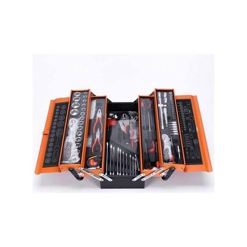 Have every odd-job and task around your home covered with theCantilever Tool Box. This comprehensive metric tool kit comes with a huge assortment of practical tools ranging from sockets and pliers to hex keys and a handy screwdriver. Made from high-quality chrome vanadium, these are dependable and enduring tools that perform to an exceptional standard. The box itself is built with a high tensile powder coated steel enclosure to withstand any knocks that may occur during the course of work or transport.The tools are fitted with PVC molded inserts contained in all compartments of the cantilever box. Each compartment opens out at a flat level, which makes finding and accessing each tool a cinch. The pad lockable lid and foldable handles provide security and safety, compact transport. This all-inclusive compact unit contains an incredible 85 pieces and fits discreetly on a workbench or shelf.This toolkit offers an instant collection of quality practical tools suitable for an endless list of DIY jobs. It’s the essential addition to maintain any household .Highlights• High tensile powder coated steel enclosure