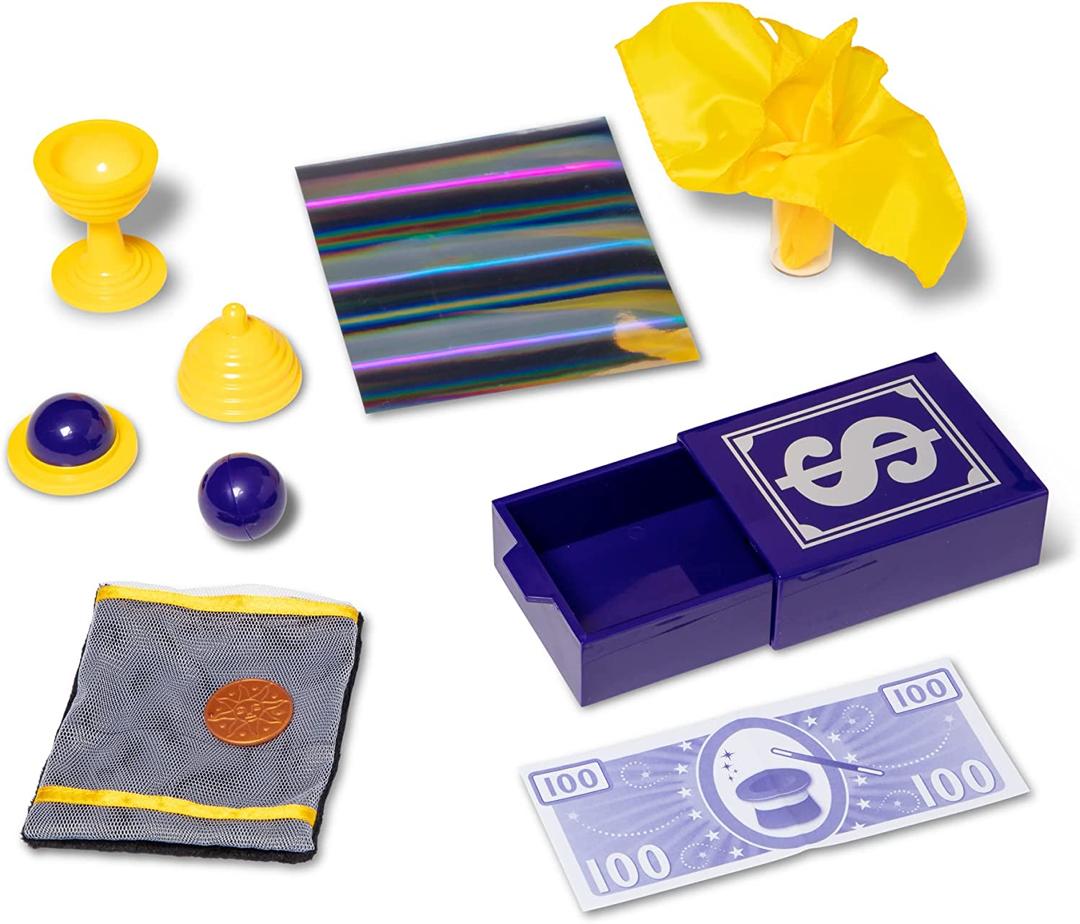 The 12-piece set includes a coin that magically appears in a mesh bag,