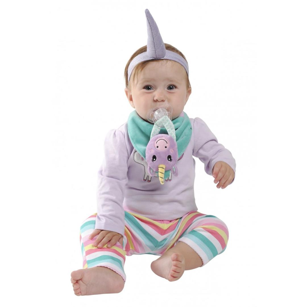 The removable and wearable plush sensory toy holds baby's pacifier (any with handle) or teether. It provides baby convenient access to their pacifier or teether while having fun interacting with their soft, cuddly buddy. The soother/teether holding buddy can be removed and used separately from bib (affixed to stroller, car seat strap or wrist etc.). The soft fabric bib with water resistant layer contains drool and keeps clothes dry and is reversible. Suggested age range is 3-12 months.