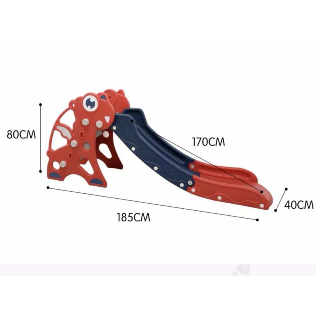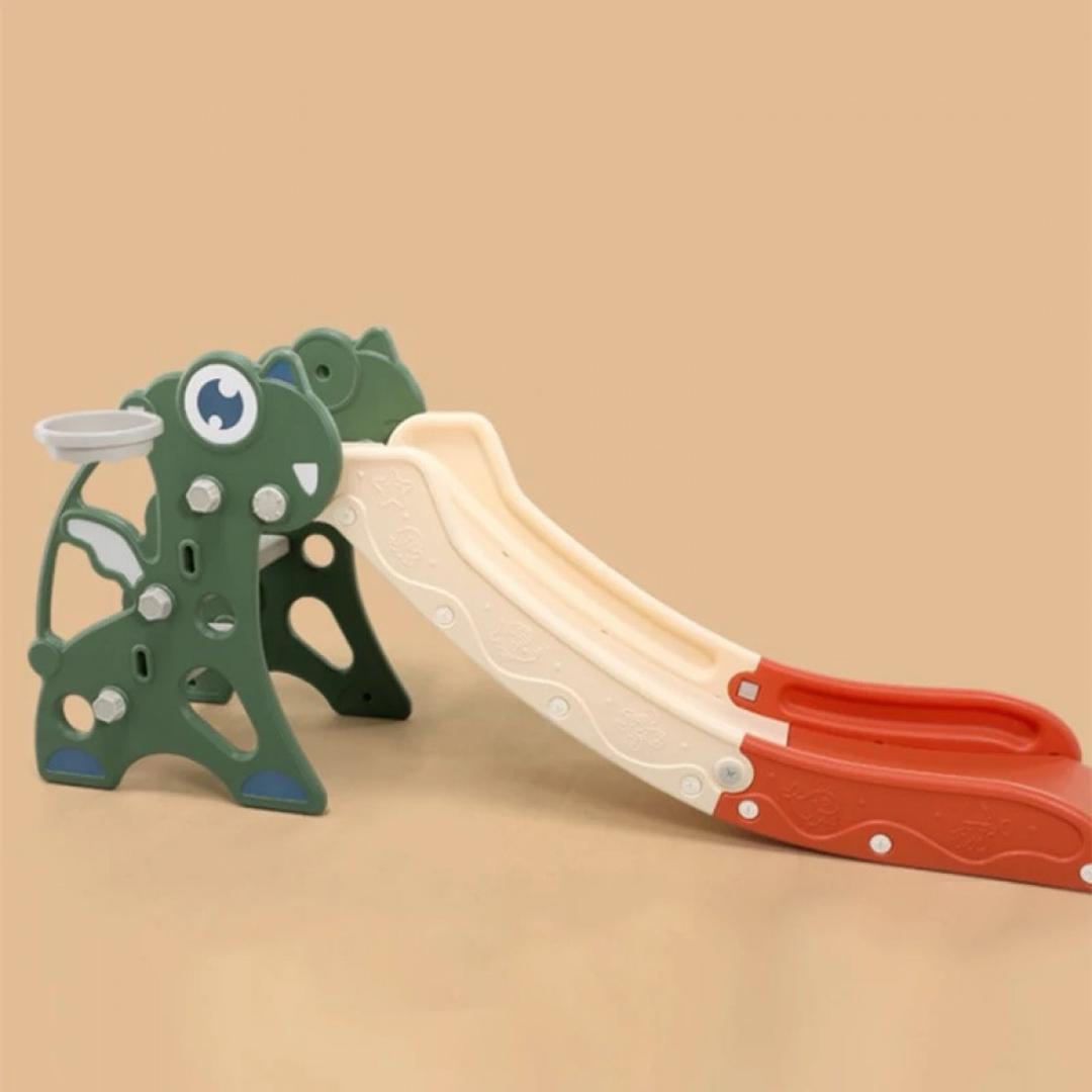 The cute dino toddler slide is made of environmental and kids-friendly HDPE material which is safe and durable. The well rounded polished edges adds extra layer of safety. Your kids will enjoy endless play indoors & outdoor. This play slide has a basketball hoop and baby can enjoy sliding, basketball shooting, ring hoop play all on one slide. The widened and extended slide with acceleration zone, deceleration zone and buffer zone is designed scientifically and ergonomically to allow children fall safely. The dino slide is easy to assemble within 10minutes and can be stored by simply folding it up. Dimensions (L x W x H) 60 x15 x 31 inches. Age 1-4yrs.