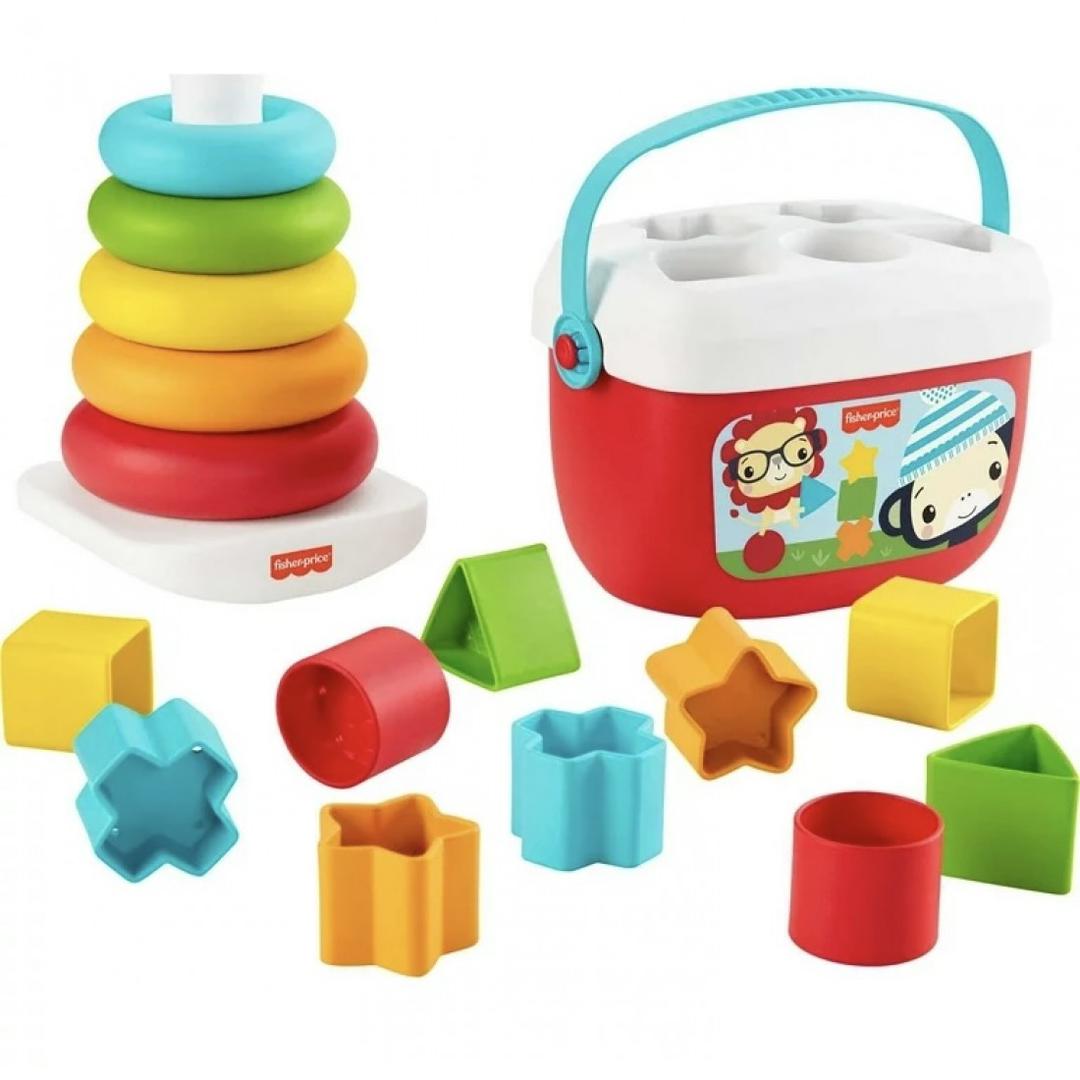 Beneath a pile of stars, squares and triangles, baby finds it: The ring to top them all. This Fisher-Price gift set combines two classic baby toys made from plant-based materials*. Open a bucket of fun with Baby’s First Blocks, a set of 10 colorful shape blocks for sorting, stacking, and drop-through play. The iconic Rock-a-Stack toy features a bat-at rocker base and 5 colorful rings to grasp and stack. This adorable gift set is loaded with hands-on play that helps your baby develop dexterity, hand-eye coordination, and problem-solving skills. (*Toys made from a minimum of 90% ethanol extracted from sugar cane.)