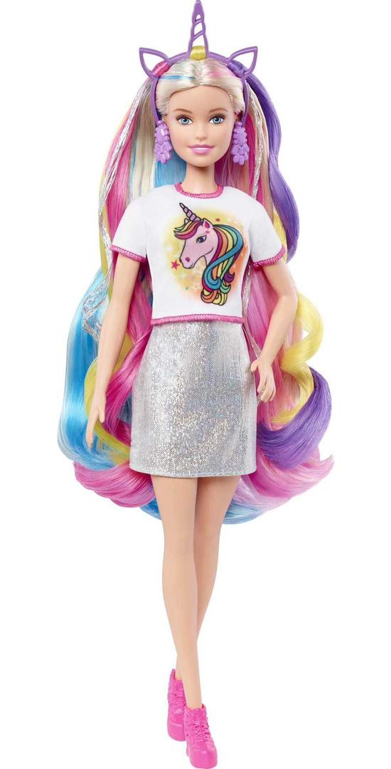 Barbie Fantasy Hair doll comes with 2 fantasy looks -unicorn and mermaid -for an instant and easy fashion transformation. Dress Barbie doll in the blue mermaid graphic t-shirt and add the crown decorated with starfish, seashells and 2 long teal hair extensions to dive into the mermaid look. Or leap into the unicorn look and dress her in the rainbow t-shirt with unicorn graphic and the crown with a horn, ears and 3 colorful hair extensions in pink, yellow and purple. Use the included hairbands and 2 hair clips to style Barbie doll’s long, colorful and glitter-streaked blonde hair for an even more fantastical look. Her shimmery iridescent party dress is ready to be transformed; accessorize with silvery shoes or sneakers and finish the look with a pair of purple drop earrings.
