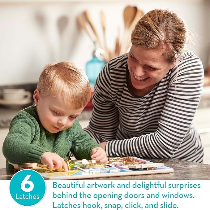 The Melissa & Doug Wooden Latches Board is an entertaining and educational activity play board.