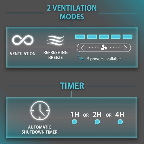 Timer with automatic stop after 1H, 2H or 4H of continuously blown air. Sold with a remote control allowing you to make remote settings.