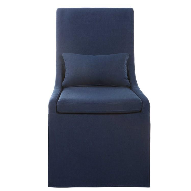 This upholstered chair is made of a high-quality fabric finish for the cushion, giving it a sleek and modern look. Simplistic in form, this casually cosmopolitan armless chair features a tailored blend slipcover with a plush cushion seat and kidney pillow for extra comfort. Has added performance treatment to resist soiling and stains.