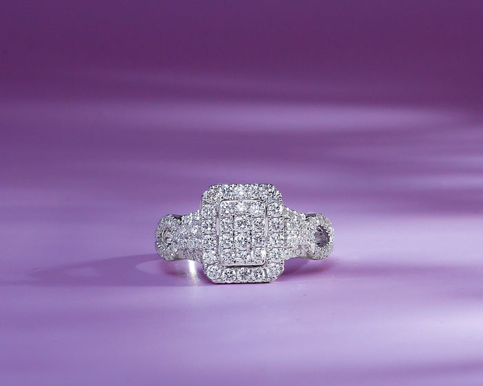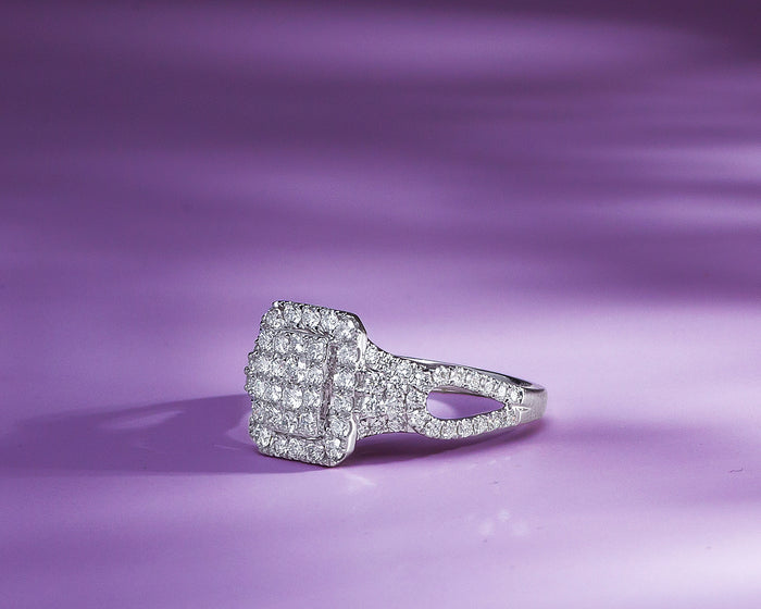 - It has an Emerald-cut clustered center stones, surrounded by a single halo with petite diamond stones encrusted on it.
