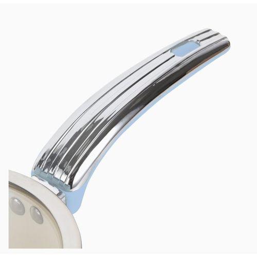 Stay-cool, soft-touch Bakelite handles with metallic accents offer safe and comfortable control over your cooking