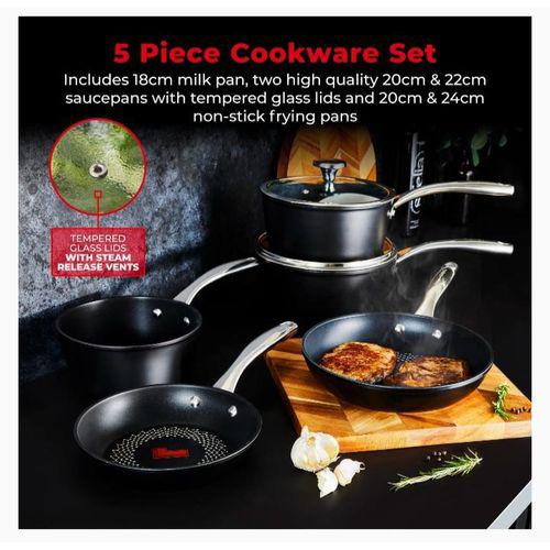 5 PIECE COOKWARE SET: The essential cookware set for all of your cooking needs. Consisting of an 18cm milk pan, 20cm/22cm saucepans & 20cm/24cm frying pans, you have the versatility to cook a variety of different pasta dishes or fluffy pancakes. The saucepans have tempered glass lids with steam vents, allowing for greater control over cooking, letting you take a peek without interrupting the cooking process