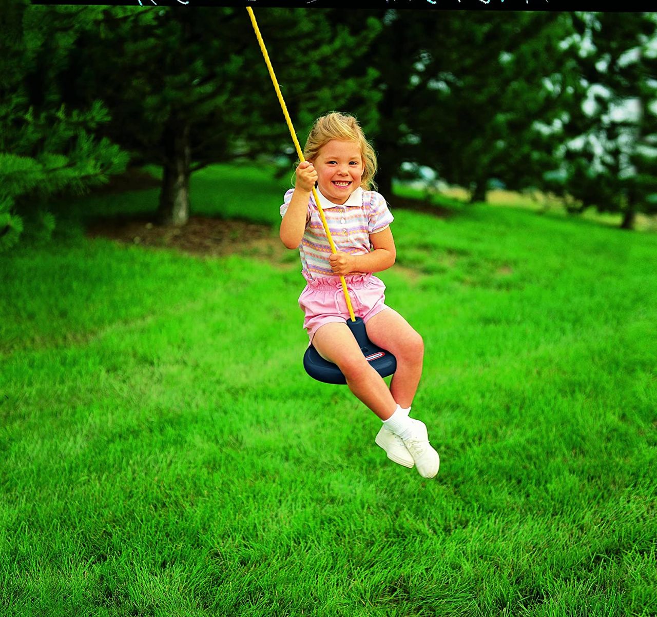 Classic plastic disc rope swing can be hung from any tree branch to provide hours of swinging fun. Molded plastic neck helps protect child’s leg from rope. Solid durable construction. Includes 10 feet of rope to accommodate different tree heights.