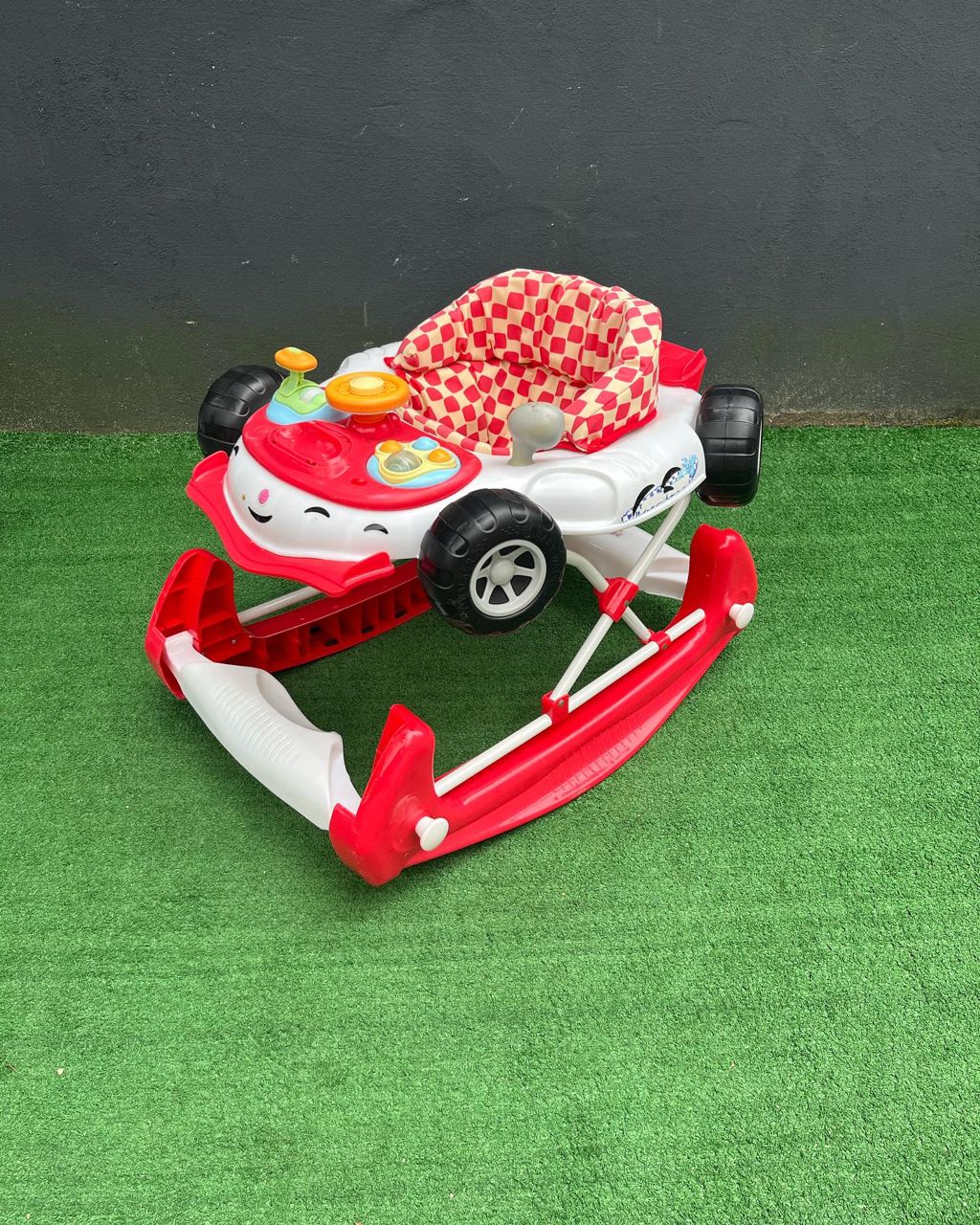 Super bracing car style rocker/walker for babies aged 5months+ to 11kg. Detachable musical play tray adds to the excitement of this hugely popular walker. Check padded seat and foot pad with speed stripe stickers and moveable plastic tyres adding to the sense of fun.