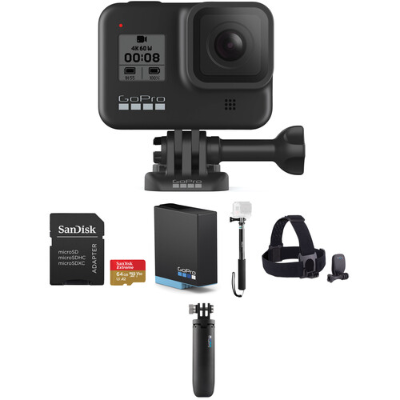 Key Features HERO8 Black (4K60 Video, 12MP Stills) 64GB microSD Card with SD Card Adapter GoPro Head Strap + QuickClip Extra Battery; Revo 11-37" Selfie-Stick