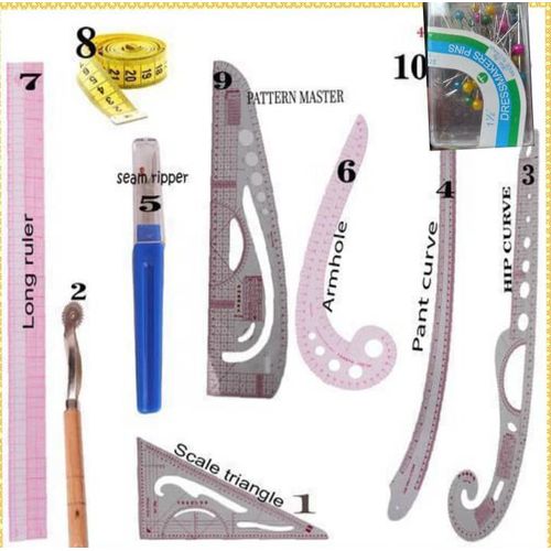 This Product contains a 7in1 set of Multi purpose French curve rulers. These Rulers are Unbreakable, Flexible, Bendable and highly Durable. the items CONTAINS 7 tools which are: a Long straight ruler, Hip Curve, French Curve ruler, Tracing wheel( For tracing patterns on paper instead of a blade), pant curve, pattern master. e.t.c Features: