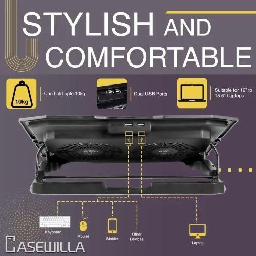 Ergonomic Desig : Laptop fan cooling pad as an ergonomic stand, with 7 height-adjustable. Also equipped with a detachable non-slip baffle, effectively prevent laptop slipping off. Dual Efficient Fans : The laptop cooling stand has two large fans of 14CM, the fan is equipped with blue LED lights, working voltage: 5V, current: 0.35A, USB cable length: 50 cm. Unique USB Port Desig : Laptop cooler fan with built-in two USB ports, one for connecting laptop USB ports , one for connecting more USB devices .Such as a mouse, keyboard, just plug and play, easy to use.