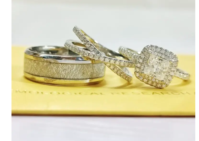 The Quinn – Gemma Moissanite Bridal Set with Crisp Titanium Male Band is a beautifully coordinated trio designed for elegance and durability. The bridal set features brilliant moissanite stones arranged in a sparkling Gemma-inspired design, set in premium sterling silver for a refined finish. Paired with a sleek, matte-finish Crisp Titanium male band, this complete set offers a perfect blend of radiance and strength—ideal for couples who want matching pieces that symbolize lasting love.