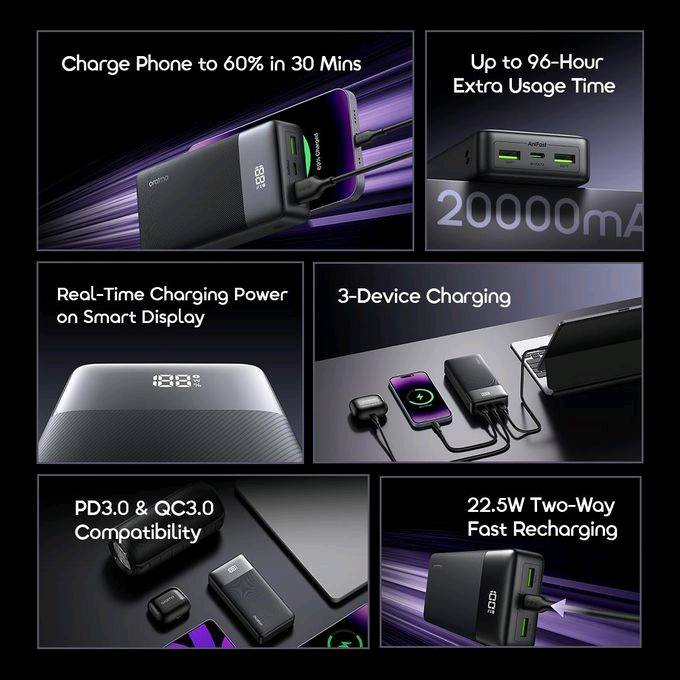 Charge iPhone 15 Pro to 60% or Samsung S24 to 50% in 30 minutes. AniFast tech powers you up fast—no time wasted.