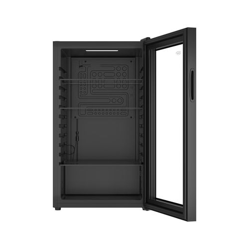A compact cooler with a 90-litre capacity, perfect for storing and displaying drinks. The transparent glass door allows you to easily see your beverages inside.
