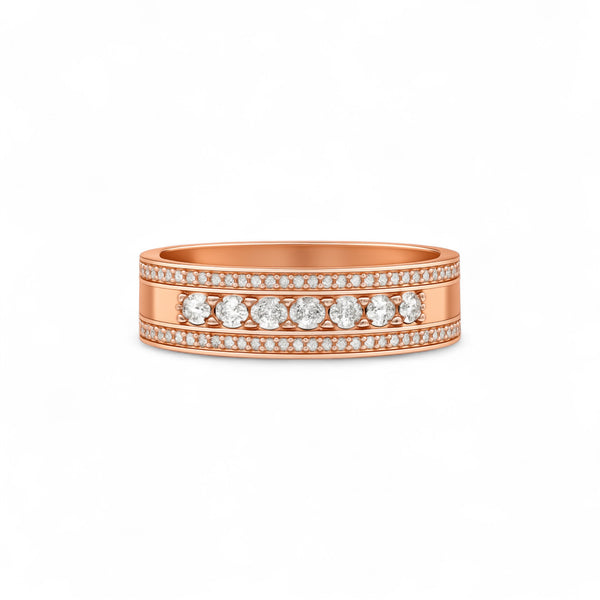 The Charming Natural Diamond Wedding Band in 18K Gold is a timeless symbol of everlasting love. This beautifully crafted band features a row of natural round-cut diamonds, meticulously set to maximize sparkle and create a seamless flow of brilliance across the finger.