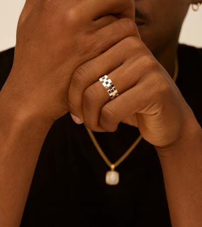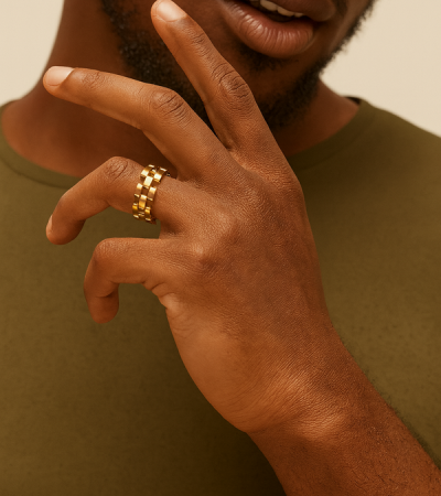 Its sculptural silhouette adds texture and character, making it the perfect statement piece for those who appreciate modern minimalism with a touch of attitude. Whether worn alone or layered, the Link Band is a powerful symbol of strength, unity, and style.