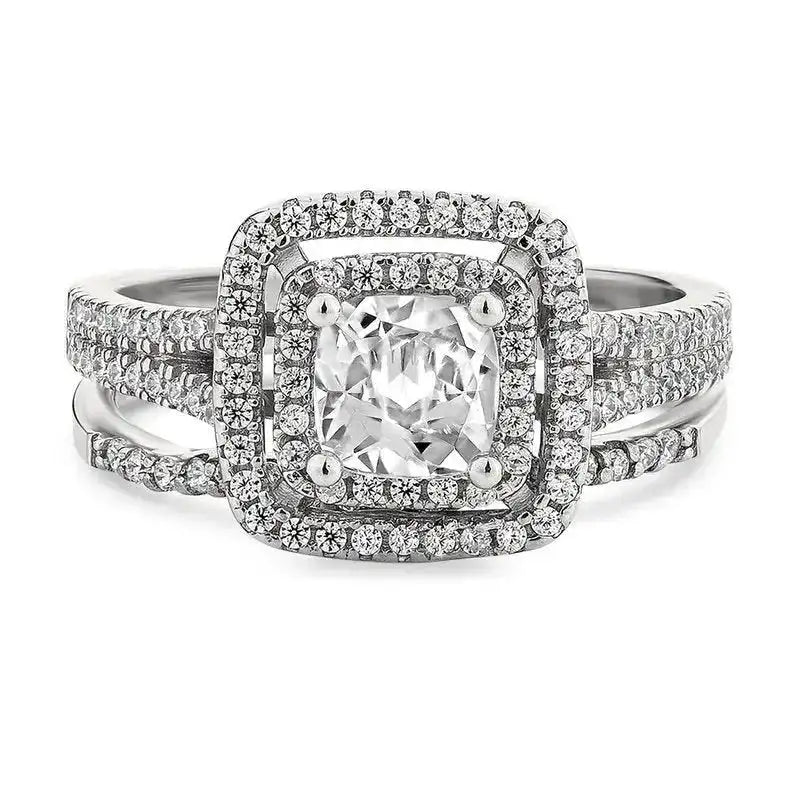 Stones: Set with a premium quality 6mm cushion-cut clear cubic zirconia center stone and round pave set cubic zirconia accent stones