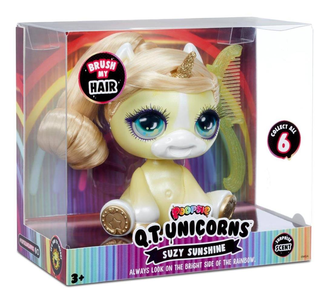 Introducing Poopsie QT Unicorns™, collectible mini unicorns available in a rainbow of colors. Each cute little unicorn has beautiful long brushable hair that you can style. Also includes a comb. Plus, each unicorn has a surprise aroma, like birthday cake or gummies and more! This is Suzy Sunshine, she is a beautiful yellow unicorn who is so happy to meet you. She thinks only of happiness and the good side of life! Pull out the trading cards on the back of the package to learn more about each character and trade them with your friends. Collect all 6 Poopsie QT Unicorns™ to complete the rainbow.