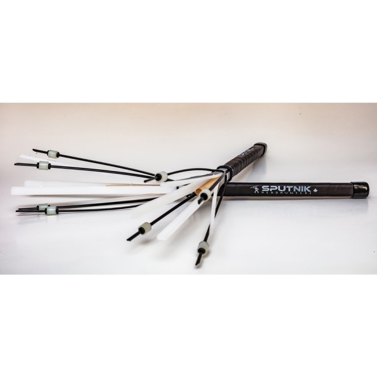 Sputniks are part flat stick, part square, part bundled rod. Each corner is fitted with a 1/8_ black polypropylene rod. Each rod has an adjustable nylon bead. There are 3 “O” rings. The inner “O” Ring can be used to pull the white slats tightly together and the outer “O” rings are used to pull in the black rods. The slats are bendable, so they can be manipulated to produce different sounds and bounce. By adjusting the “O” rings forward or backwards, it is possible to produce a very tight bundled rod sound or a very loose attack sound like multiple drummers playing slightly out of sync.