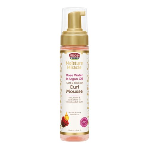 African Pride Moisture Miracle Rose Water & Argan Oil Curl Mousse is lightweight foam blend of rose water and argan oil made to condition hair while adding body, control and a flexible hold. Leaves natural styles defined, frizz-free and soft.