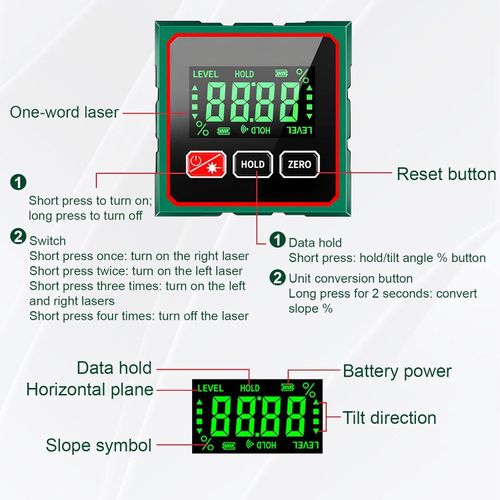 Dual Laser Lines: Projects two clear red beams, easily activated. Features a zero-set function and toggles between absolute and relative angle modes.
