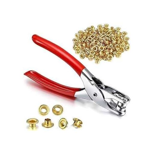 This Grommet Eyelet Kit is a practical tool set designed for adding and repairing metal eyelets on fabrics, leather, canvas, tarpaulins, tents, belts, and other materials. It includes a sturdy red-handled grommet plier tool and a transparent storage box filled with hundreds of silver metal grommets neatly organized for easy access.